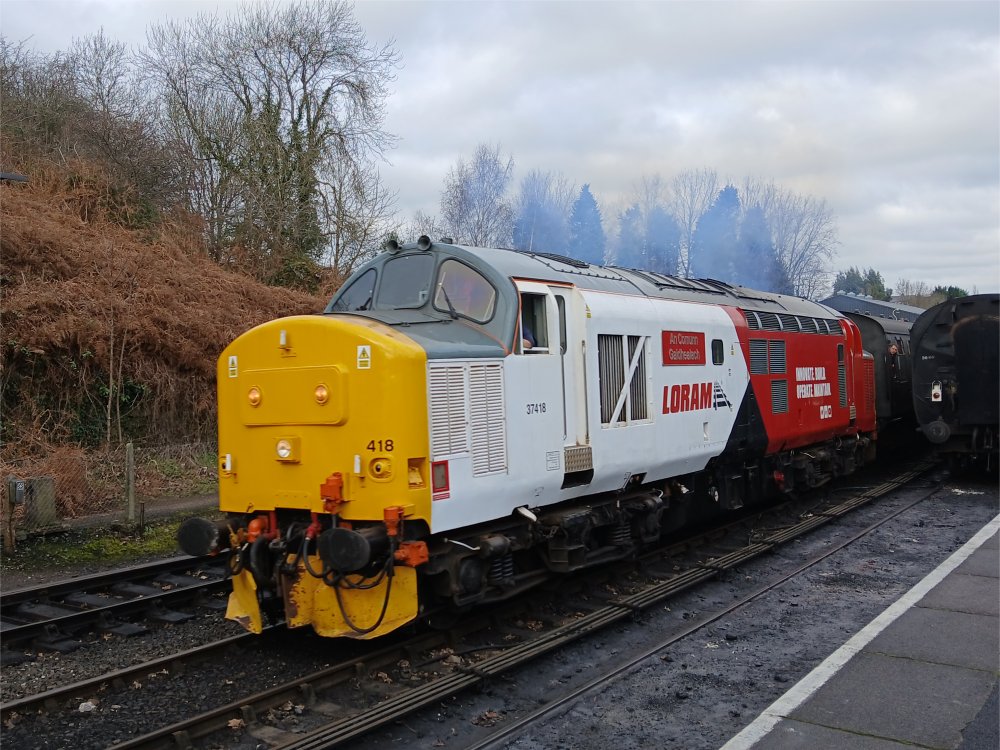 Loram's Class 37 37418 An Comunn Gaidhealach at Bridgnorth during a charter on 27 December 2025. The locomotive worked three round trips between Kidderminster and Bridgnorth on the day.
