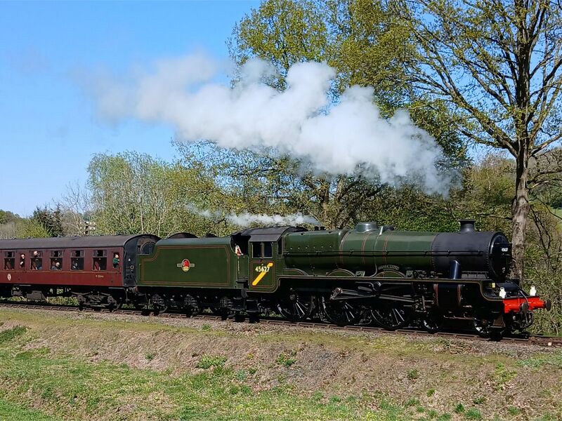 Spring Steam Gala 2025 guest locomotive 45699 Galatea: LMS Stanier Jubilee 6P class 4-6-0, running as 45627 Sierra Leone; first operating appearance at the SVR. The engine was last on the SVR from 1987 to 1994 in ex-Barry Scrapyard condition.