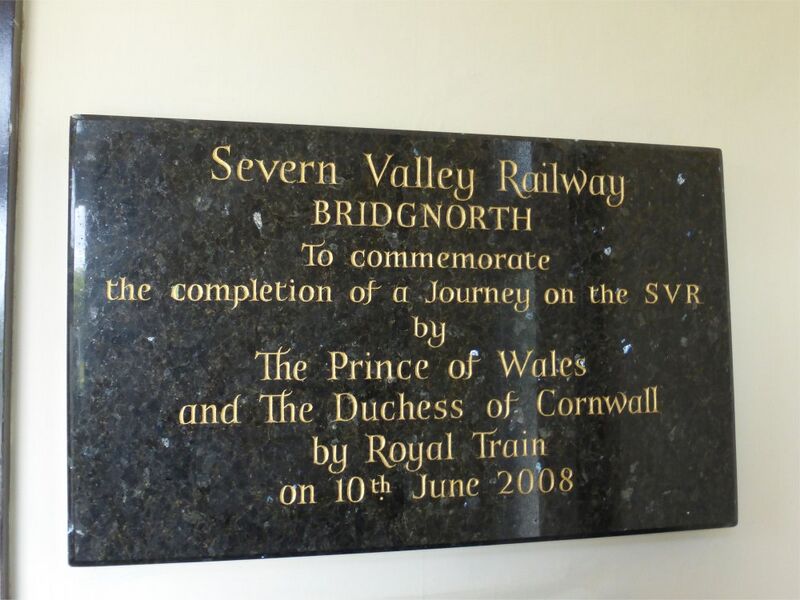 10 June 2008 saw a visit to the SVR by Their Royal Highnesses Prince Charles and the Duchess of Cornwall. This plaque commemorating the event is on display in the entrance to Brignorth Station.