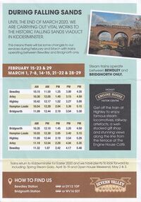 2020 saw the 50th anniversary of the official opening of the SVR. A 'must-do' engineering project was starting, an overhaul of Falling Sands Viaduct, with trains restricted to the Bridgnorth to Bewdley section from 30 December 2019. Full-line services were intended to resume on 4 April, with dates set for regular special events including the Spring Steam Gala, Open House Weekend, Spring Diesel Festival, Step Back to the 1940s, Steam on the Road, On the Buses, etc. Celebrations to mark the 50th Anniversary of running were also planned for 23-25 May.[1]